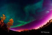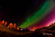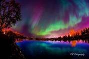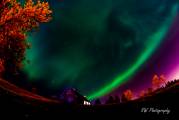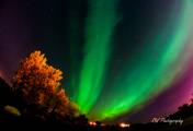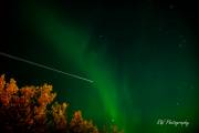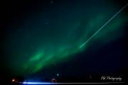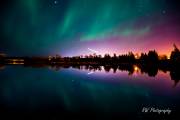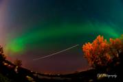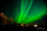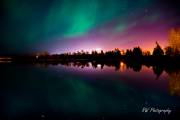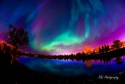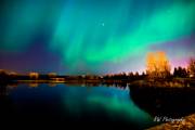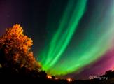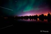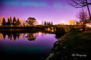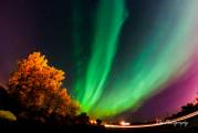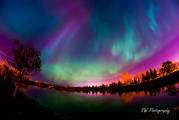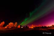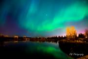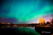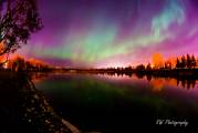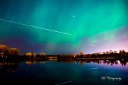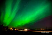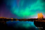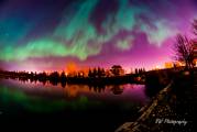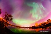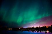 Можете мне не верить, но сегодня, когда ветер стих, небо стало чистым и температура упала к вечеру, я мужу сказала, что сегодня ночью должно быть северное сиянье. Сказала и забыла. Часов в 11 пошли Жака гулять, а небо-то всё сияет. Меня удивляет второе сиянье подряд, оно через весь небосклон, такого никогда не видела в Виннипеге. Обычно сияет на северной части неба, а сегодня, куда ни глянь, везде Аврора. Фотокамерой не покажешь весь небосклон, только часть. Правда, выручает в таких случаях линза - рыбий глаз. Мы загрузили фотоаппаратуру и поехали за город на 59 дорогу. Потом по ней же доехали до Килкона парк и сделали несколько снимков над водой. Полосы на фотографиях, след самолетов больших и не очень.