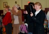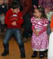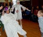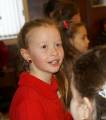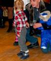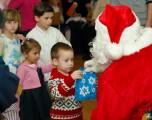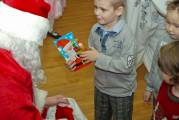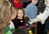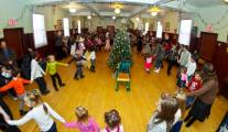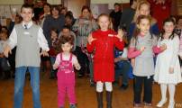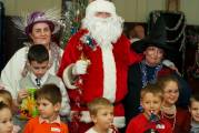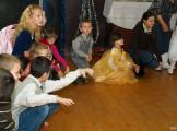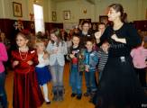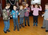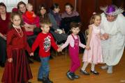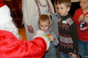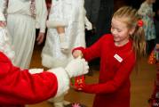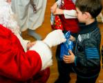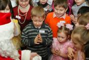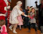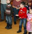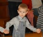 Забавно наблюдать за самыми маленькими. Идет хоровод, поют, танцуют, а один малыш заинтересован елкой, стоит, в нее заглядывает, игрушки рассматривает, осторожненько трогает пальчиками и по барабану, что там вокруг происходит. Другая принцесса всё пыталась что-то найти под елкой, чего-то ожидала увидеть, обползала её со всех сторон и на пол ляжет заглянуть, но неудача постигла, ничего не нашла, потом решила стены обследовать, под стулья заглядывать, в общем занята была настоящим делом, не до гулянки. Третий малыш не мог стоять на месте, всё порывался бежать, но у папы зоркий глаз, от себя не отпускал. Присутствовали и совсем маленькие, сидели на коленках родителей, удивленно смотрели на происходящее вокруг. Спектр эмоций был очень широк у всех присутствующих. Атмосфера праздника получилась замечательной.