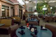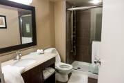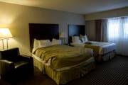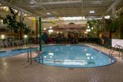 И, в заключении хочу рассказать о гостинице, исправляюсь, получила несколько нареканий, что никогда не фотографирую гостиниц, что тоже интересно читателям. Мы ночевали в той же гостинице, где проходил Немецкий и Шотланский павильоны, название ей Виктория Инн. Гостиница из разряда обычных, где есть номера нескольких классов, в ней имеется небольшой тренажерный зал, бассейн, джакузи, детская площадка, ресторан и залы для конференций. Понравилось оформление и дизайн отеля. Окна номеров выходят к бассейну, на втором этаже балконы, на первом уровень бассейна. Растут настоящие деревья, на улице мороз 40, а ты выходишь из комнаты в халатике и ныряешь в воду. В стоимость гостиницы входит завтрак. В ресторане тоже все прилично, усаживаешься за столик внутри или с видом на бассейн, тебя обслуживает официант. Порции огромные, все сьесть не получилось. И извините за беспорядок в комнате, вспомнила о фото уже утром и стараться заправлять кровать, как спец, не стала.