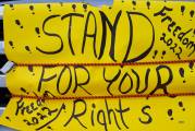 У Сити Холл организация сбора посерьезнее, площадка, колонки, микрофоны для выступающих. Заранее сделанные транспаранты раздаются всем желающим. Звучат воззвания, толпа сканирует в ответ: - "Свободу! Свободу! Свободу!"
