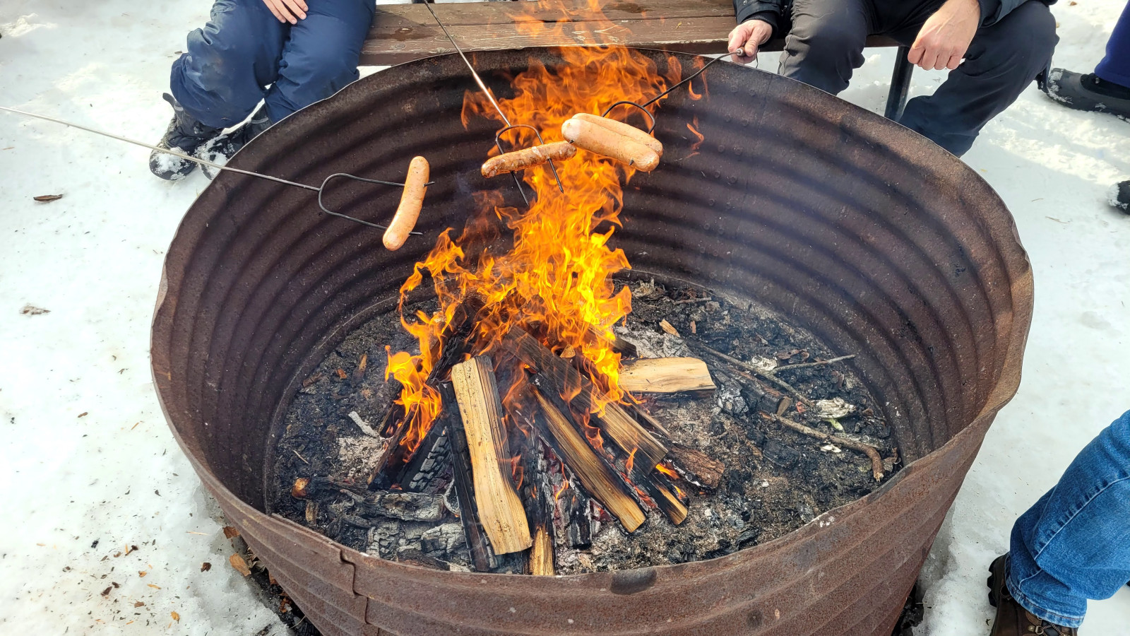 Всех накормила вкусным супом. Помощницы испекли хлеб, наготовили блинов со сметаной, вареньем, творогом, даже с паштетом из щуки. Все что-то принесли к общему столу. Фермерские сосиски традиционно подогревались на живом огне.