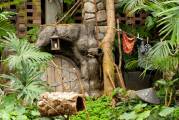 Пальмовый дом построили в 1914 году, позже в 1968-ом здание увеличили за счет пристроек, которые сегодня составляют единое целое. Среди пальм можно увидеть домик джунглей, от него натянута веревка и сушится белье. Встретить небольшой водопадик, перекатывающийся в пруд с живыми рыбками. Каменные лица, выдолбленные из огромных валунов, обросли лианами. Вдоль дорожки стоят скамеечки, где можно присесть и помечтать, наслаждаясь атмосферой. Во второй комнате выставка цветов. В марте проходит ежегодная выставка орхидей Что в остальные месяцы - не знаю и это здорово, сюрприз. Так, однажды нас встретила творческая экспозиция живых цветов "Алиса в стране Чудес". В день пикника медвежонка Тедди очаровательные, сногсшибательной красоты и размера, лилии и флоксы заполнили выставочный зал.