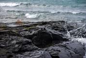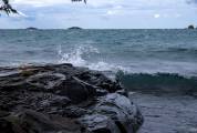 Все вчетвером мы дошли до берега, до которого пришлось преодолеть возвышенность, высотой может в 2-3 этажа, через поросшие деревьями скалы. Вышли мы на пляж из мелкого черного гранита, очень похож на Черный пляж Гавайского острова Мауи, лишь с разницей в происхождении породы, там мелкая черная галька из лавы вулкана. Прибрежные скалы тоже очень схожи в виде замысловатых фигур. Берег состоит из небольших уютных пляжей, разделяемых скалами. Перелез через скалу, новый пляж.