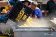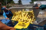 Отдельно хочу рассказать о приготовлении кукурузы - весь процесс отработан до мелочей. Початки выгружают, пропускают через агрегат с механической очисткой, где кожура выкидывается под машину, а чистая, обрезанная кукуруза выходит в специальный лоток. Далее ее загружают в пластиковые коробки и переносят ближе к кипящим котлам. Варят по времени, сначала воду доводят до кипения и закидывают продукт.