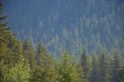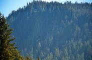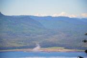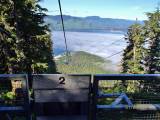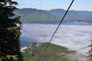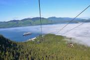 Итак, мы в начале нашего тура забираемся на гору на автобусе. Дорога в гору занимает 45 минут через леса по серпантину, чтобы слететь потом с вершины горы за 90 секунд. Нас приветствует попа орла и его гнездо на дереве. Едем через рыбацкую деревушку под названием Hoonah (Хуна), бывшее русское поселение. Однажды тут случился грандиозный пожар, сгорело почти все, уцелела лишь русская церковь. Просто мистика какая-то, она же тоже деревянная и стоит в самом центре деревушки. Наш гид из местных останавливает нас во всех красивых местах, чтобы мы могли полюбоваться видами. И напрашивается на чаевые. Поднимаемся выше облаков, проезжаем какое-то лесное озерко, медвежий угол.