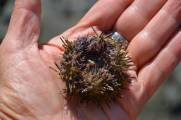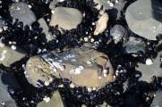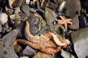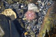 Потом мы просто погуляли по берегу. На берегу после прилива чего только не увидишь. Образуются так называемые tide pools, в которых выброшенная на берег океанская живность может переждать засуху, пока ее снова не накроет волной. Океанские водоросли очень прочные, длинные и толстые, как канаты, валялись повсюду. Выброшенные на берег медузы, осколки морских ежей, раковины. Под камнями прятались морские звезды, дожидаясь прилива. Посмотрела, сфоткала и воздвигла камень на место.