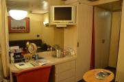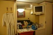 Да, что еще нужно сказать. Каюты на корабле бывают разные. Причем, очень разные. От самой дешевой внутренней каюты без окон (за вот эти самые указанные выше деньги) до пентхауса с роялем. Есть, разумеется, и промежуточные варианты – каюты с окном, с верандами, разного рода «свиты» и т.д. Даже уточняется, какой именно вид вы получите из своего окна – полный или частично заблокированный спасательными шлюпками, например. Ну и ценовой диапазон соответственен видам и роялям. Не знаю, чем народ занимается в своих номерах и зачем им веранды и рояли, но на корабле мы обычно в них приходим только спать и переодеться, принять душ (хотя его и так ежедневно принимаешь в СПА). К счастью, на круизных кораблях даже самые простенькие внутренние каюты имеют все удобства. Они расположены выше ватерлинии, начиная с 3-й палубы (ниже живет многочисленный экипаж), достаточно просторны даже для троих (когда путешествуем вчетвером, то берем 2 каюты), в них есть кровати, душ, куча шкафов с полками и плечиками, телик (который мы никогда не включаем, правда), ДВД, мини-бар, сейф, стол, диван и т.д. То, что в них нет окон, для меня даже и лучше, потому что лично я люблю спать в полной темноте и тишине. Убираются в каютах всегда дважды в день, то есть, когда бы ты ни пришел в каюту, там всегда чисто. Заправлять и расправлять кровати не надо – все сделают за тебя. Можно оставить любой бардак, хотя мне все-таки совесть этого не позволяет. Деньги оставлять на кровати тоже не надо – чаевые вычитаются автоматически. В общем, все очень продумано и удобно. И главное в том, что независимо от того, в какой каюте ты живешь, ты пользуешься всем остальным на корабле наравне с теми, кто живет в пентхаусе с роялем. И если внутренняя каюта стоит, к примеру, баксов 600-800 на человека, то пентхауз стоит тысячи 3-4 на одного. К крутым «свитам» прилагается собственный портье, но я лично не вижу разницы между собственным и тем, кто убирается у тебя ежедневно – это все равно постоянный человек, точнее, два (один пылесосит, другой перестилает постель, чистит раковину и т.д –я не раз видела, как убираются в других каютах). Просто в больших каютах работы больше. Еду в каюту и кофе в постель по утрам мне тоже не нужно, я вполне в состоянии добраться до ресторана и попить кофе с видом на океан.