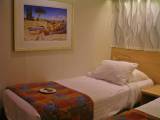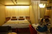 Может быть, кого-то заинтересует, как выглядит каюта на корабле, я всегда их снимаю вначале, как только мы заходим туда. Кровати можно попросить раздвинуть – получаются две односпальных у стен, а третья полка просто опускается, как в купе поезда, но она довольно широкая и с бортами – не упадешь даже во время шторма. Альтернатива – спать на диване. Они могут сделать так, как тебе удобнее. На день они все равно убирают твою постель, а вечером застилают ее обратно. На кровати кладут программу на сегодня – ее кладут ежедневно накануне, в программке указано все, что в этот день происходит на корабле. Описание порта, часы работы всех ресторанов-магазинов и спортивных площадок на корабле, развлекательная программа по часам и прочие полезные вещи.