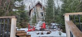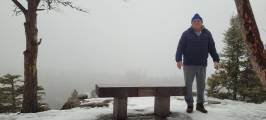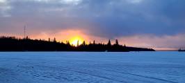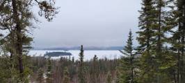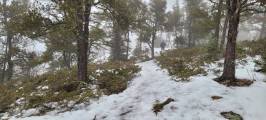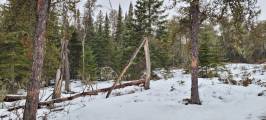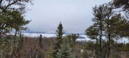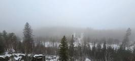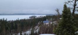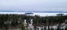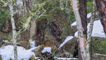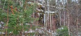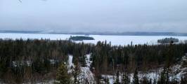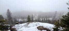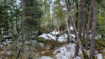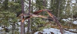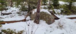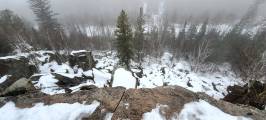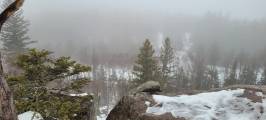 Тропа петляет зигзагом в горизонтальной плоскости и вертикальной, лёд, камни, бугристые корни, поваленные деревья, даже букву А увидели, сотворенную природой из поваленных деревьев, ложбинки с подтающим снегом. И туман, даже в лесу. Мужественно идём через сосновый лес и гранитные скалы Канадского Щита за потрясающим видом на Соколиное озеро с обрыва. На пути застывшие водопады, заснеженные вершины, зимой лес преображается, становится светлее что ли. Огромный плюс зимнего путешествия - полное отсутствие комаров. Вы можете сказать: - "Какие горы-водопады в Манитобе, не смешите", а они есть, но в миниатюре, что мне очень нравится. В Манитобе есть всё, от кактусов, черепах, песков и калибри до водопадов, северного сияния и белых медведей, а в середине вообще огромный список. Шагаем, смотрим на следы дикой жизни, отпечатки оленьих копытц, заячих, беличьих лапок. Медведи, видимо еще спят, что очень хорошо.
