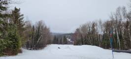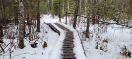 Зимой воздух за городом особенно свеж, дышится легко и свободно. На тропе появились указатели тропы для горных велосипедов Five of Diamonds. Деревянный настил идет на огромный валун, на вершине прерывается и опять продолжается на скате, это для велосипедистов сделано, чтобы смогли проехать через каменную глыбу.