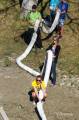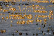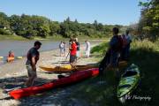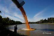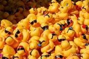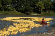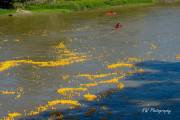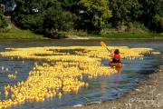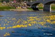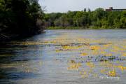 Долго советовались, время уже 13:20, решили будь, что будет. Выкинули утят в реку и они пошли вниз по течению. С барьером для уток - опять неудача, он рвался, утята проплывали под ним, в открытое пространство. Практически все 13 тысяч прошли барьер спокойно, не колыхаясь. Работа с установкой барьера началась за пару часов до старта, но всё напрасно, не справились. И поплыли наши утята в Ледовитый океан. Правда, появились ловители на байдарках и пытались их вычерпывать из реки. Утят выпустили 13.000 штук, байдарок было 4 штуки. На мосте представители провинциального департмента Сохранение Окружающей Среды заверили разволновавшийся народ, что утята не представляют угрозу природе. Какая угроза, опрокинули в реку 20-ти тонник, по-доброму относясь к природе и всё. Задача утиных гонок собрать средства для Ассинибоин парка, каждая утка стоила $10 или 3 за $25. Предположительно денег собрали 60 тысяч.