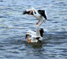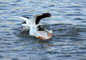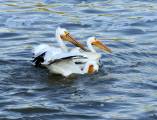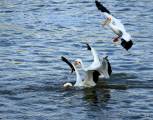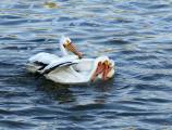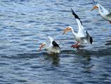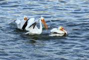 Чайка увидела рыбу, кинулась в воду за ней. Следом за ней три пеликана, чайку отогнали, рыбка из клюва первого пеликана вырывается, он справиться не может. Второй в борьбе перехватывает рыбешку и все спокойно. Действо длилось может минуту, а может и меньше. Отогнали чужака-наводчика, затем повоевали между собой и приняли спокойно победителя. Следующая минута - абсолютно мирная картина, прижавшись друг к другу качаются на воде три пеликана.