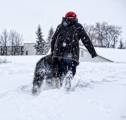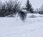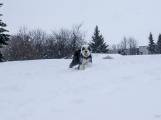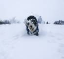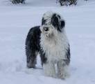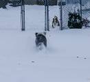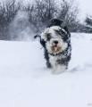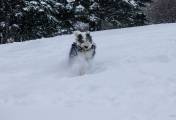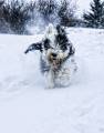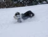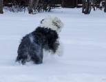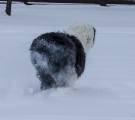 Вернулись домой, где нас ждал наш добрейший, наполовину белый и целиком пушистый Жак. Выпустили его за калитку в свободном режиме. От неожиданности, пес встал, как вкопанный, растерялся, неужели свобода. Около дома его никогда раньше не отпускали, только в специальном безповодковом собачьем парке. После наших взбодряющих слов разрешения, Жак понесся вспахивать нетронутую снежную целину. Среди поднятого снега от его лап, стал, практически, невидимым, одним огромным шаром. Попозировал мне у крыльца, отличным послушанием удивил, наверно, все-таки не понимал, что происходит. А это, просто зимняя сказка.