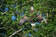 На катере есть волшебный мотор на батарейках и управляется пультом и, что самое замечательное, он бесшумный. Знаете, есть игрушки с управлением, вот и мы были на таком "игрушечном", огромном катере, находились в нем и управляли движением кнопками. Так придвинулись к орлу почти впритык, может метров 15-20, дальше уже шли камыши. Орлан сидел и сушился, лишь иногда поворачивая голову на разные звуки. Потом мы решили его спугнуть, чтоб в полете поймать. Кричали, сигналили, свистели, он сидел. А начали мы потихоньку, орлу по барабану, продолжает сидеть, развесив крылья. Вот это выдержка. Тут мы уже поднатужились, зашумели все вместе, он медленно поднялся в воздух и ушел в сторону леса.