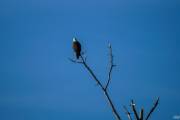Вдруг он прошелся совсем низко над водой, близко от нас и увидев лодку, поднялся, примостился на прибрежном дереве. И не поверите, посидел, пооглядывался, сначала расправил одно крыло, затем второе и замер. Он сушил перья. Картина потрясающая. Сидит невозмутимо, не обращает внимания на мир, сушится.