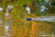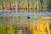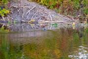 Увидев красоту, мы и остановились для фотографий. И вдруг, движение, круги по воде. Присмотрелись, около противоположного берега голова бобра с немаленькой веткой в зубах. Утепляется на зиму, невдалеке куча веток, владение бобра. С веткой занырнул под домик и выплыл опять нас поразвлекать.