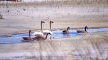 Сначала Вселенная удивила нас спектаклем выдр, который можно увидеть в статье Артистические выдры, теперь надеемся на встречу с белоснежными грациозными птицами. Внимательно смотрим на прибрежные открытые водоемы, слегка притормаживая увидев воду. И да, вскоре встречаем три лебедя вместе с гусями. Вернулись!