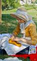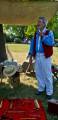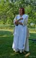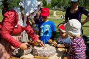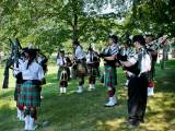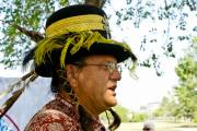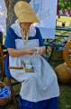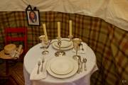 Звуки волынки царили в воздухе, хотя самих музыкантов в юбках не видно. Пошла на звук. Они укрылись в тени деревьев, встали кружком и дудели. Люди в одежде прошлых лет занимались обыденными делами прошлого, пряли, шили, вышивали, стругали, молотили зерно. Красовалась палатка губернатора Красной реки господина MacDonell, ему много приходилось разьезжать по службе, как нам демонстрируют сегодня, ездил он с удобствами. В палатке ковры на полу, кровать под шкурами зверей, красиво обшитыми, столовое серебро, тонкий китайский фарфор, кожанный небольшой сундук для шляп, виски, оружие - всё в арсенале. В палатке молодой экскурсовод с упоением рассказывает об истории нашего края. На входе же сам губернатор приветствует гостей с сигарой в руке.