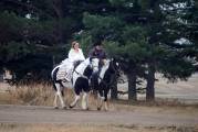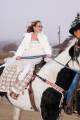 Наша первая задача на свадебном торжестве - запечатлеть приезд невесты. По традиции, её сопровождает отец жениха верхом на лошадях. На улице стало морозно и ветрено но невеста стойко выполнила положенное ей шествие. Все гости ждали её появления.