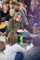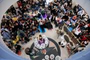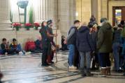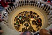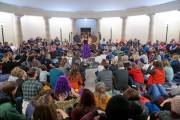 Люди расположились на полу, кто сидя, кто лежа, кому не хватило места, стоя и на втором этаже приняли удобную им позу.