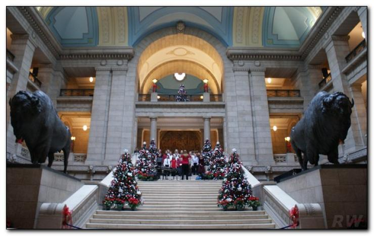 для всех желающих парламент Манитобы с золотым мальчиком на крыше, так было и в этом, 2009 году. Если, вы, зашли в центральную дверь здания, перед вами открывается мраморная парадная лестница (вы знаете, что на ней 39 ступеней или 3 раза по 13? это отдельная статья, надо когда-нибудь осветить эти неслучайные цифры. Вообше, зданию парламента можно посвятить целую книгу, в нем столько магического, множество стилей, эпох, переплетений символов, духу не хватает написать обо всем), на ней хор, музыканты, все в цветах, разукрашенных елках, бантах, фонариках, огоньках, в общем, праздник.