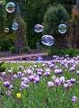 Девушка на дорожке перед клумбой с тюльпанами. Сидя пускала мыльные пузыри, затем фотографировала, пузыри, сьемка, пузыри, сьемка...