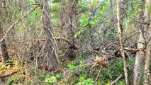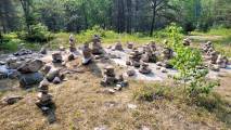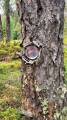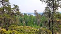 Она находится на крутом берегу Манитобского залива озера Высокое. Лишь залив в Манитобе, остальное озеро в Онтарио. Дачу окружают густые заросли лесного орешника. Идем по туристической тропе до домика на скалах, где дерево, украшенное зеркальцами. Видите Валеру? А он есть.
