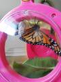 Также быстро произошел и процесс выхода бабочки из кокона. Это заняло меньше получаса. Очень поразило это прекрасное превращение! В тот же день мы вечером отправились в Riverbank Discovery Centre – естественная парковая зона в Брендоне у реки Ассинибойн, чтобы выпустить бабочку в природу. Мы знали что там уже цветёт milkweed, нектаром которого бабочка питается. Открыли клетку у самого цветка и, недолго думая, бабочка села на него и стала пить нектар. А мы в это время сделали достаточное количество фотографий бабочки. Детям было жаль с ней прощаться, но такова жизнь животного мира – в неволе она определенно не могла бы полноценна жить. Ждем следующего нашего опыта по разведению бабочек в будущем году.