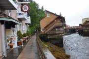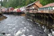 Главной улицей города, а так же основной туристической достопримечательностью  является Крик-стрит, расположенная вдоль ручья, по которому против течения идет на нерест лосось. Вы увидите ниже мои фотографии этой улочки, где все дома построены на высоких деревянных сваях. Своего рода достопримечательность города. Если постоять на мосту и посмотреть, можно увидеть буквально на секунду выпрыгивающую из воды рыбу.  Ручей довольно бурный и каменистый, тем не менее рыба упорно идет вперед, используя напор воды себе на пользу каким-то хитрым способом. И какие только опасности тут ее не поджидают. Кроме людей с удочками еще и притаившиеся в воде морские котики (видели одного), а выше по ручью в лесах и в горах  медведи. До нереста дойдут самые везунчики, чтобы там наметать икры (или оплодотворить ее) и погибнуть от истощения. А до ручья доходят те, кому повезло не быть пойманными или съеденными в океане. Здесь даже водится безвредная для человека лососевая акула, а вообще врагов у них много –те же котики, касатки, и разные более крупные и хищные рыбы, тунцы, например.