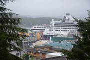 С утра мы отправились на экскурсию по городу. Сначала погуляли по Крик-стрит, потом мы поднялись на фуникулере на гору, чтобы оттуда взглянуть на город. Коренное население Аляски – алеуты и прочие народности, родственные нашим чукчам и индейцам, у них тоже распространены тотемные столбы. На горе идет тропа, мы по ней погуляли и полюбовались сверху видами городка и гавани. Живность на Аляске крупная. От гигантских слизней до самых крупных в мире медведей-кодьяков – медведи не попались, пришлось удовольствоваться слизнем.