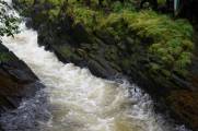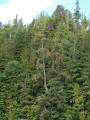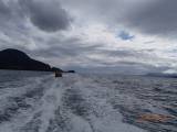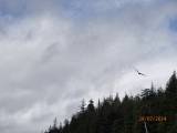 Плыли мы вдоль разных островков, видели многочисленные водопады, спускающиеся с гор. Издалека видели фонтанчик кита, но когда приблизились, он, видимо, нырнул. А это надолго – ждать практически бессмысленно, так как киты могут находиться под водой до получаса и неизвестно еще, где вынырнут. Один раз остановились, и гид показал куда-то в строну берега. Оказывается, на одном из деревьев сидел орел, вернее, американский белоголовый орлан, официальный символ США, красавец. Наши гиды решили проделать трюк. Бросили в воду рыбу, в надежде, что орел своим зорким взглядом ее увидит и спустится за ней. Мы все остановились и затихли. Какое-то время ничего не происходило. Но потом он полетел! Сделав несколько кругов над водой, стремительно бросился в воду и уже через несколько секунд сидел на дереве с добычей. Снять «мыльницей» его стремительный полет и момент атаки на рыбу не удалось, но кое-что получилось.