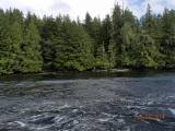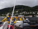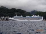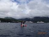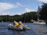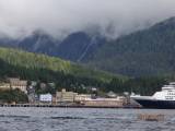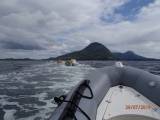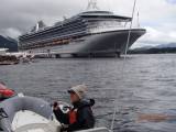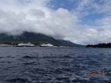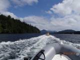 После обеда у нас был первый тур на Аляске под названием Back Country Zodiac Expedition. То есть, мы на надувных моторных лодках-«Зодиаках» фирмы «Хонда» носились по побережью и между островами Revillagigado Island and Gravina Island. У нас была лодка на троих, а всего их отправилось 4, в первой  наши гиды. Гонка получилась довольно экстремальная, на хорошей скорости, с кучей брызг, но такой кайф! Подтрунивала над мужем, который рулил – ему прежде не доводилось самому управлять моторной лодкой, вот, «на старости лет» довелось... Пока слушали инструктаж, как этими моторками управлять, я озиралась по сторонам в поисках интересненького и нашла каких-то пушистиков под деревянным настилом – какие-то губки, лепятся повсюду. Во время тура мы в основном мы неслись за ншими гидами по воде «на всех парусах», а когда было что-то интересненькое, они подавали нам сигнал остановиться и посмотреть. Или рассказывали что-то. Чтобы мы не промокли и не простудились, нам всем выдали непромокаемые и теплые костюмы, шапки,перчатки, маски на лицо и резиновые боты. Но, пожалуй, эта была излишняя смера предсоторожности, ибо было солнечно и довольно тепло. Просто они расчитывают, что тут дожди каждый день. Тур был довольно недешевый – что-то 140 на человека, кажется, но очень хорошо организован. Нас прямо от пирса посадили в вэн, привезли в какое-то здание, там дали переодеться (свою лишнюю одежду и рюкзаки мы там и оставили), показали видео, все объяснили по рассадили по лодкам. На обратном пути нам раздали фотки с нами в лодках, угостили очень вкусным паштетом из местного лосося и аляскинским пивом. К сожалению, я взяла с собой только плохонький фотик – побоялась, что будут брызги, а зря. Так что фотки получились так себе, а посередине 2-х часовой поездки еще и батарейка кончилась. Но что-то снять успела. Ребенок сидел на бортике лодки, рискуя свалиться в воду во время гонки по волнам. Для него это была особенно  «адреналиновая» поездка, но ему очень понравилось!  Мне тоже понравилось подлетать в воздух на сильной волне, мы так хохотали при этом! Настроение у всех было просто супер!