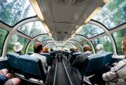 Покупаешь самый дешевый билет, два ряда по два сиденья с каждой стороны, без номеров. Есть уже развернутые кресла по два напротив друг друга и со столом в середине, можно и самим развернуть, если есть потребность. К вашим услугам буфет со стойкой бара, столами и сиденьями. Затем комната отдыха с мягкими креслами и диванами, комната заканчивается полукругом, все стены сделаны из окон, обзор великолепный. Из середины комнаты идет лестница на второй этаж в панорамный салон. При первой возможности проводник выполняет роль экскурсовода.