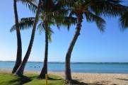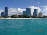 Знаменитый Вайкики-Бич на Оаху, в Гонолулу. Вернее, его самое начало. Здесь мы с удовольствием поплавали в первый же гавайский день, и народу на нем в 9 утра не было вообще.