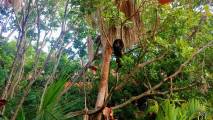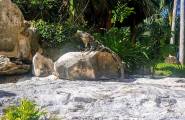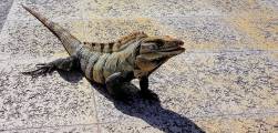На ветках вечнозеленых деревьев застыли зеленые игуаны, а на археологических останках строений Майя живут игуаны под цвет камней.