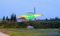 Слухи об инопланетянах получили поддержку в 1960-1970-х годах, когда по этому региону прокатилась целая волна наблюдений НЛО вкупе с обнаружением серии таинственных кругов на полях. Какой бы ни была история происхождения названия «Мунбим», оно прижилось, а город сделал инопланетян своим талисманом. Тарелка освещает трассу, приземлившийся инопланетянин стоит на крыльце туристического центра. И не думайте, что у меня "галики", они у всех в тех местах.