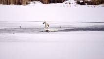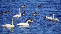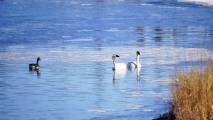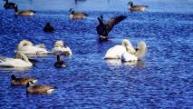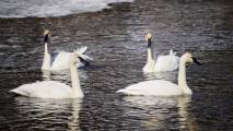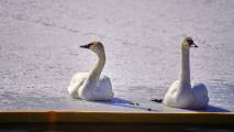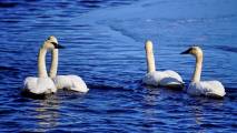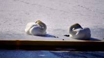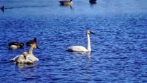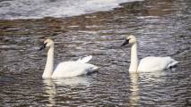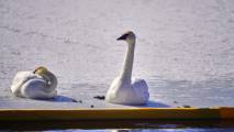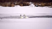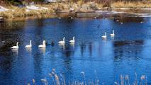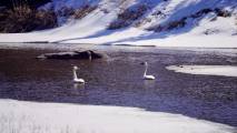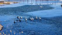 Замечательная солнечная погода, грациозно-великие, белоснежные красавцы живут своей жизнью и мы за ними наблюдаем-восхищаемся. Это счастье! Водопад приготовил снежные оладушки, водят хоровод по воде. А вокруг скалы в хрустальных сосульках, на замерзших озерах появились полыньи, проталины, зеркально отражающие окружающий мир. Нежные предвесенние краски - потрясающе!