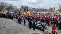 Жители Манитобы, одетые в красное и белое, собрались в Законодательном собрании Манитобы в воскресенье, в знак солидарности против тарифов и угроз аннексии президента США Дональда Трампа.