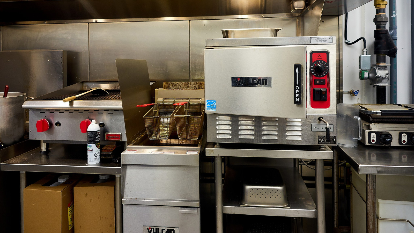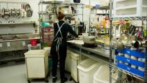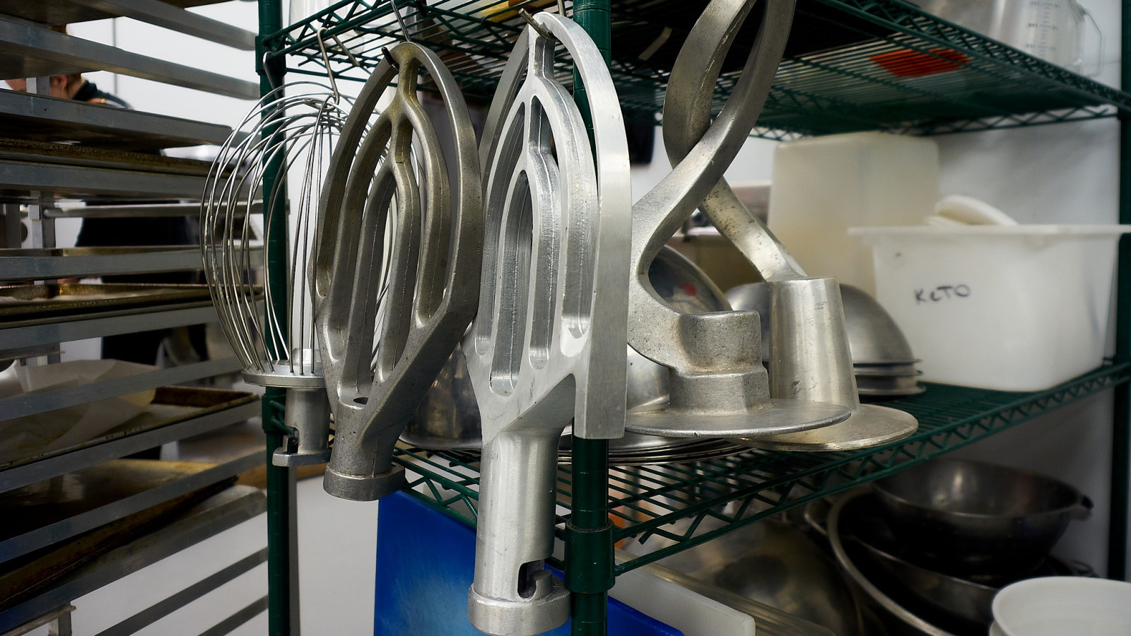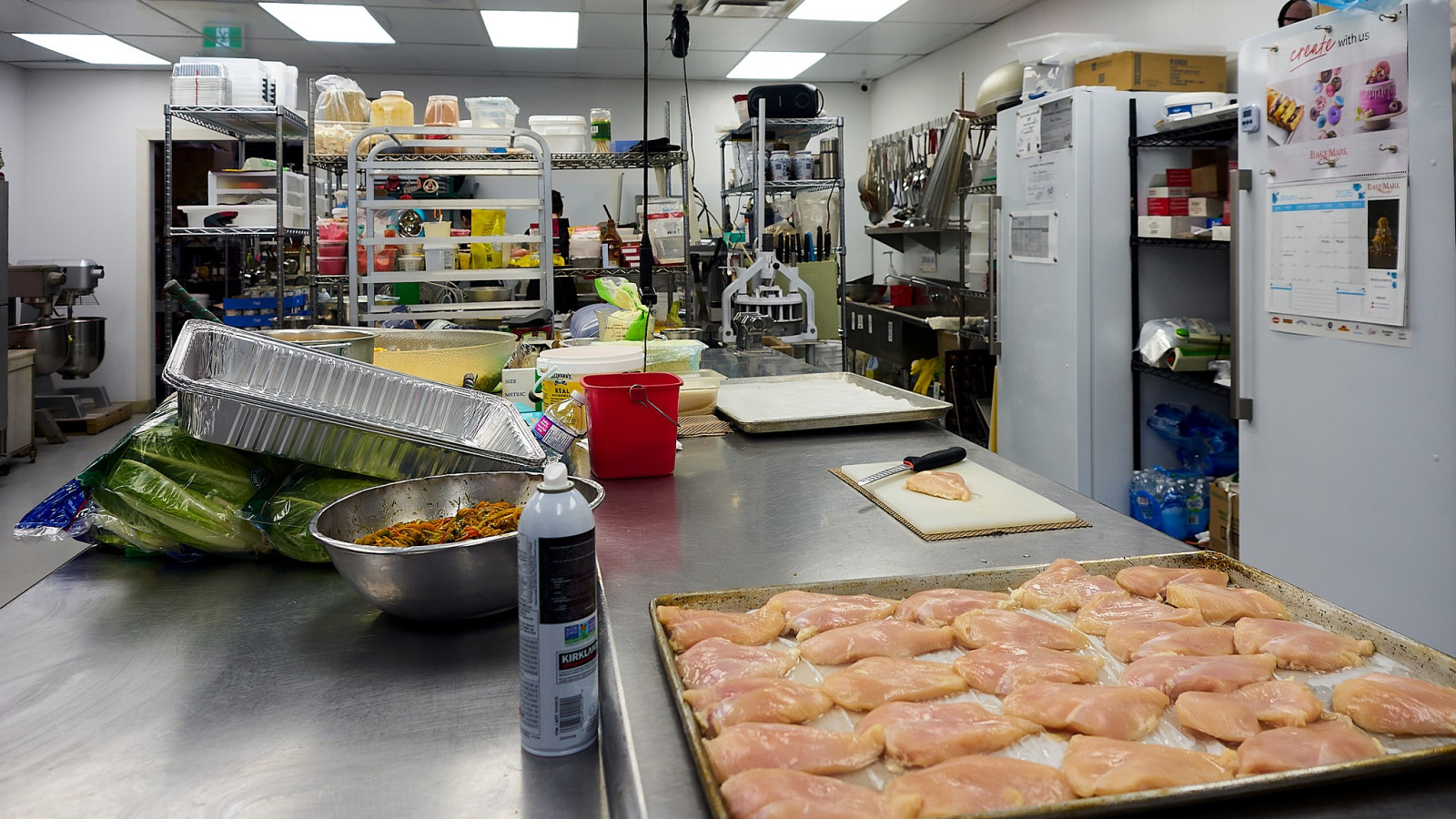Дружный коллектив трудится в New Flavours. Мы заглянули на кухню, работа горит, кто-то занимается мясом, лругой салатом, третий тестом, следующий десертом. Все на отдельных столах. Впечатлило современное, профессиональное оборудование.