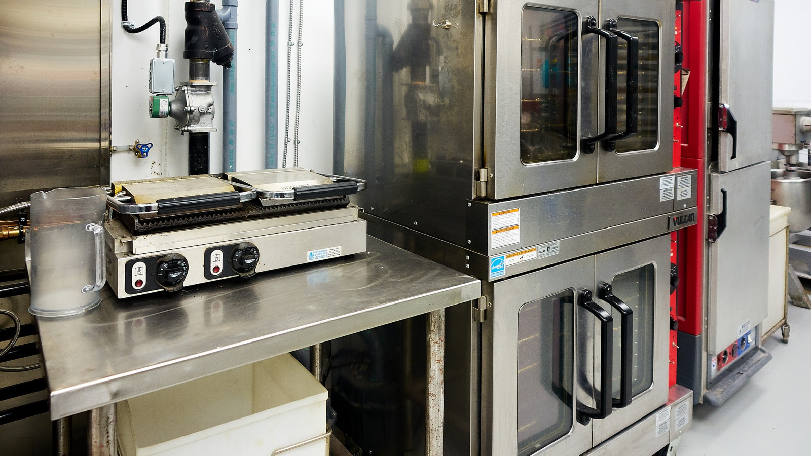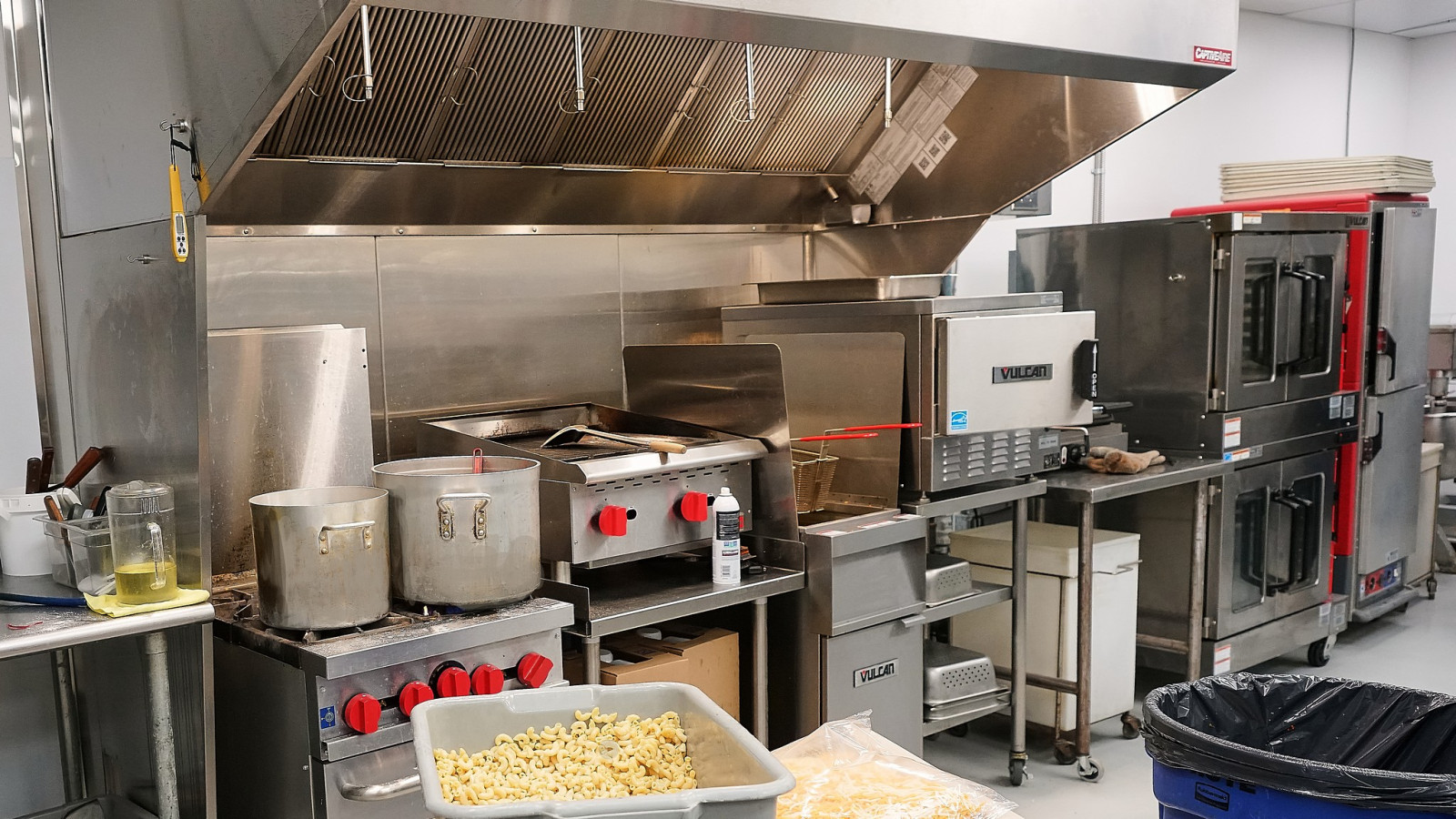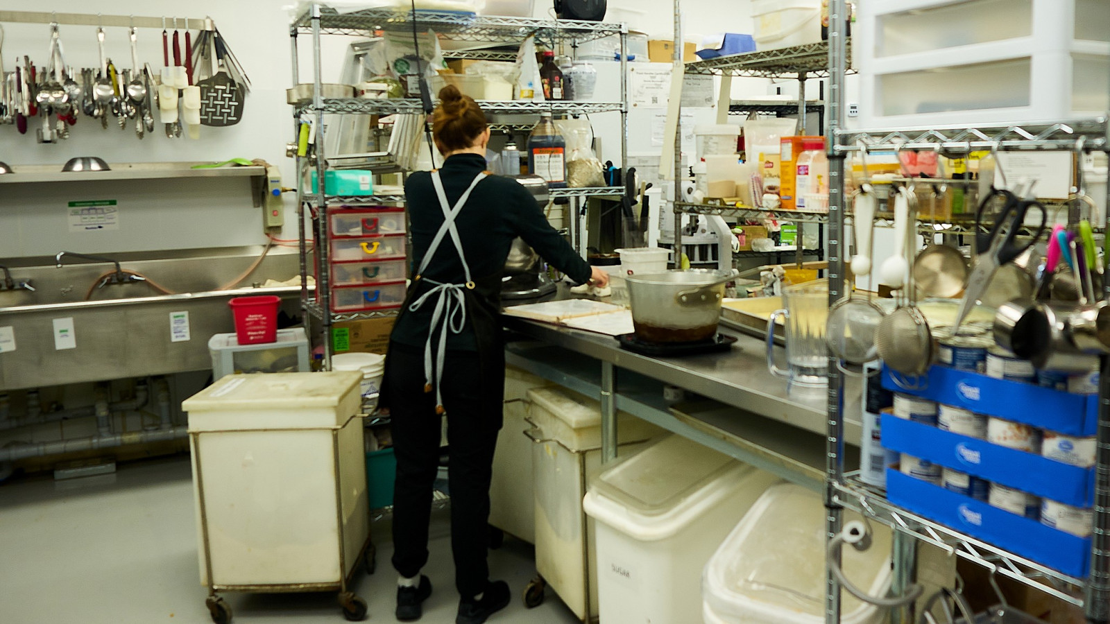 Дружный коллектив трудится в New Flavours. Мы заглянули на кухню, работа горит, кто-то занимается мясом, лругой салатом, третий тестом, следующий десертом. Все на отдельных столах. Впечатлило современное, профессиональное оборудование.