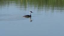 Как обычно, народу рыболовецкого уже много, стоят с удочками вдоль берега, взгляды устремлены в водную гладь, в основном: русские и азиаты, первых гораздо больше. Мы поспрашивали, кто, что поймал, у всех полная непруха. Клёва нет, но мы же должны попробовать. Наш талисман - американская поганка на посту, во всю рыбачит. Западно-американская поганка .