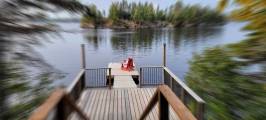 Домик из бревен со всеми условиями и личным причалом на озере, с джакузи на веранде и баней на дровах на скалистом берегу с возможностью прыгнуть в озерную гладь.