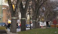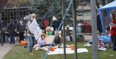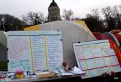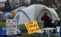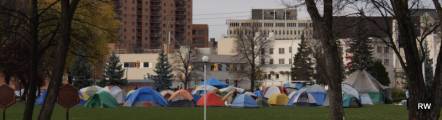 В Мемориальном парке, что у облисполкома Манитобы, с разрешения властей, расположился палаточный городок. Движение Ocсupy Wall Street набирает силу во всем мире, не в стороне оказался и Виннипег. Прийти в городок может любой желающий, посидеть у костра, послушать разговор или самому рассказать что-то. Основной лозунг собравшихся: Революция без насилия. Там, вообще, много лозунгов, есть даже такой у переносного туалета - с 8 до 8 пользуйся туалетом под Золотым мальчиком. Не забывай - это твой туалет, сохрани его чистым. Есть постоянные протестанты, кто живет в городке, их не более 30 человек, остальные приходяще-уходящие. Порой пресса нагрядывает с визитом, дают интервью. По проезжей части Бродвея гуляют с транспорантами. Полицейский вертолет - неизменный атрибут городка, из неба ведет наблюдение за происходящим и днем, и ночью. Люди хоть и живут в палатках, но для связи пользуются и нотбуками, и мобильниками. Держат связь со всеми протестующими, благодаря социальной сети на интернете. В Калифорнии во вторник полиция применила флэш-взрывные гранаты для подавления демонстрантов, ветеран войны в Ираке был доставлен в госпиталь в критическом состоянии. Новость прилетела мнгновенно, добавив холода к октябрьской погоде. Наших виннипежцев никто не обижает, если не считать мелкого воровства из пищевой палатки, застукали бездомного, активно загружающего свой рюкзак продуктами.  Появились и ходоки, одна молодая пара из Ванкувера сейчас гостит в Виннипеге. Конечная точка путешествия - Атлантика. По пути посещают все общества Оккупантов, которые участвуют в протесте по всей стране. Передают сувенирчики, приветы, предварительно связавшись по фейсбуку о местенахождении. Я стала свидетелем разговора о русской революции 17 года. Прикольно. Затем кто-то заговорил о русских в Виннипеге и russianwinnipeg.org, что меня несомненно удивило и я раскрылась, вызвав тем самым бурную реакцию окружающих. Головы оккупантов заняты не только крахом капиталистической системы, их волнуют весь негатив, происходящий в жизни, как пропажа детей, сексуальные домогательства, криминал, здоровый образ жизни, экология и многое другое.