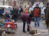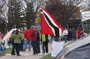 В Мемориальном парке, что у облисполкома Манитобы, с разрешения властей, расположился палаточный городок. Движение Ocсupy Wall Street набирает силу во всем мире, не в стороне оказался и Виннипег. Прийти в городок может любой желающий, посидеть у костра, послушать разговор или самому рассказать что-то. Основной лозунг собравшихся: Революция без насилия. Там, вообще, много лозунгов, есть даже такой у переносного туалета - с 8 до 8 пользуйся туалетом под Золотым мальчиком. Не забывай - это твой туалет, сохрани его чистым. Есть постоянные протестанты, кто живет в городке, их не более 30 человек, остальные приходяще-уходящие. Порой пресса нагрядывает с визитом, дают интервью. По проезжей части Бродвея гуляют с транспорантами. Полицейский вертолет - неизменный атрибут городка, из неба ведет наблюдение за происходящим и днем, и ночью. Люди хоть и живут в палатках, но для связи пользуются и нотбуками, и мобильниками. Держат связь со всеми протестующими, благодаря социальной сети на интернете. В Калифорнии во вторник полиция применила флэш-взрывные гранаты для подавления демонстрантов, ветеран войны в Ираке был доставлен в госпиталь в критическом состоянии. Новость прилетела мнгновенно, добавив холода к октябрьской погоде. Наших виннипежцев никто не обижает, если не считать мелкого воровства из пищевой палатки, застукали бездомного, активно загружающего свой рюкзак продуктами.  Появились и ходоки, одна молодая пара из Ванкувера сейчас гостит в Виннипеге. Конечная точка путешествия - Атлантика. По пути посещают все общества Оккупантов, которые участвуют в протесте по всей стране. Передают сувенирчики, приветы, предварительно связавшись по фейсбуку о местенахождении. Я стала свидетелем разговора о русской революции 17 года. Прикольно. Затем кто-то заговорил о русских в Виннипеге и russianwinnipeg.org, что меня несомненно удивило и я раскрылась, вызвав тем самым бурную реакцию окружающих.